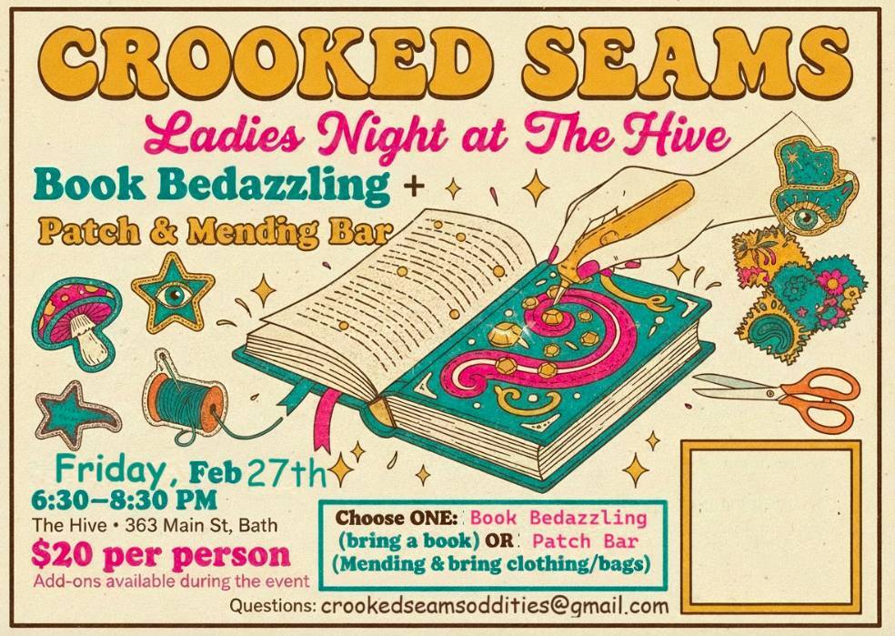 Welcome to Ladies Night with Crooked Seams! Get ready for a fun evening at 363 Main Street Bath on February 27, 2026 at 6:30 PM . Join us for a night of laughter, drinks, and great company. It’s the perfect opportunity to unwind and enjoy some quality time with your girlfriends. We will have sewing machines and patches available to have your beloved clothing mended or upcycled with patches under the guidence of sewing pro from Crooked Seams!